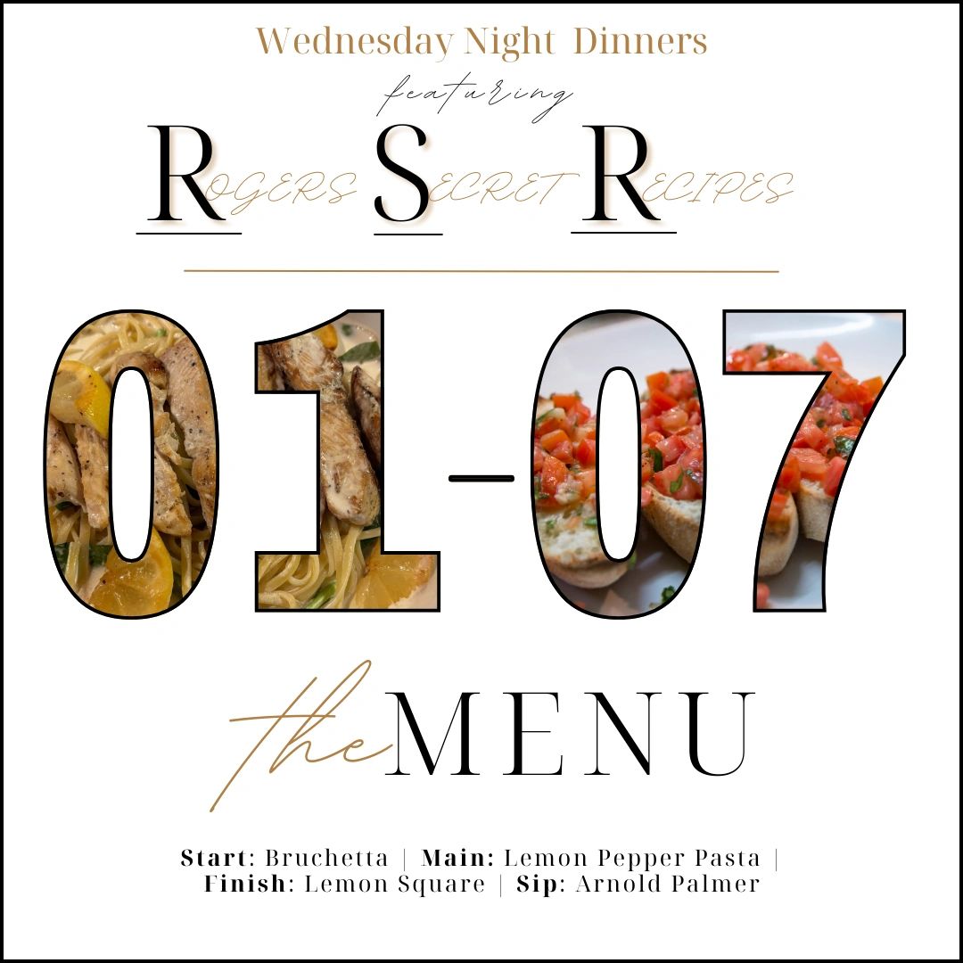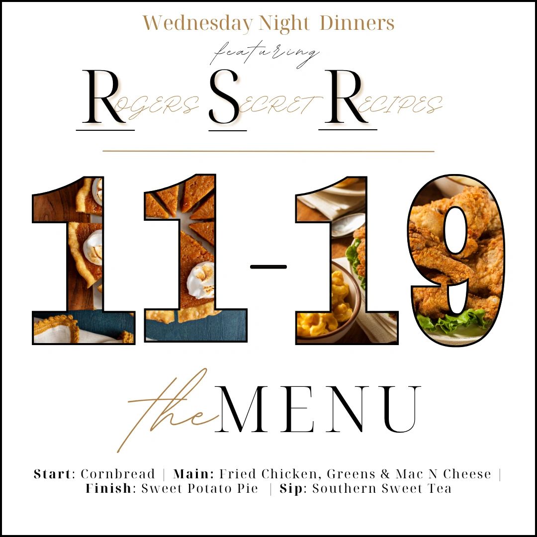 Every Wednesday night features select recipes straight from the family cookbook of our owners, Justin and Betsy Rogers. Each week they will show off a new meal to our patrons and their guests. Click below to view this week's menu and a preview of future offerings