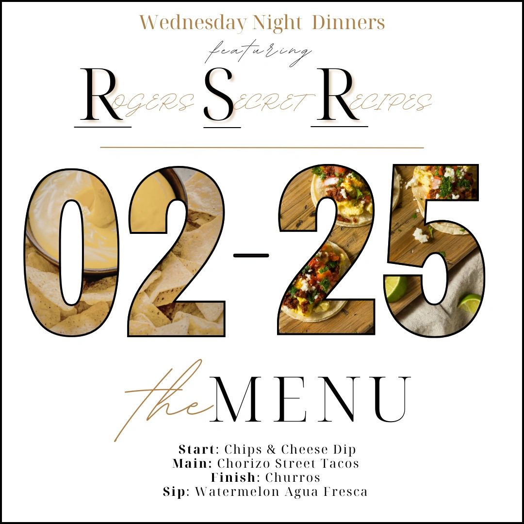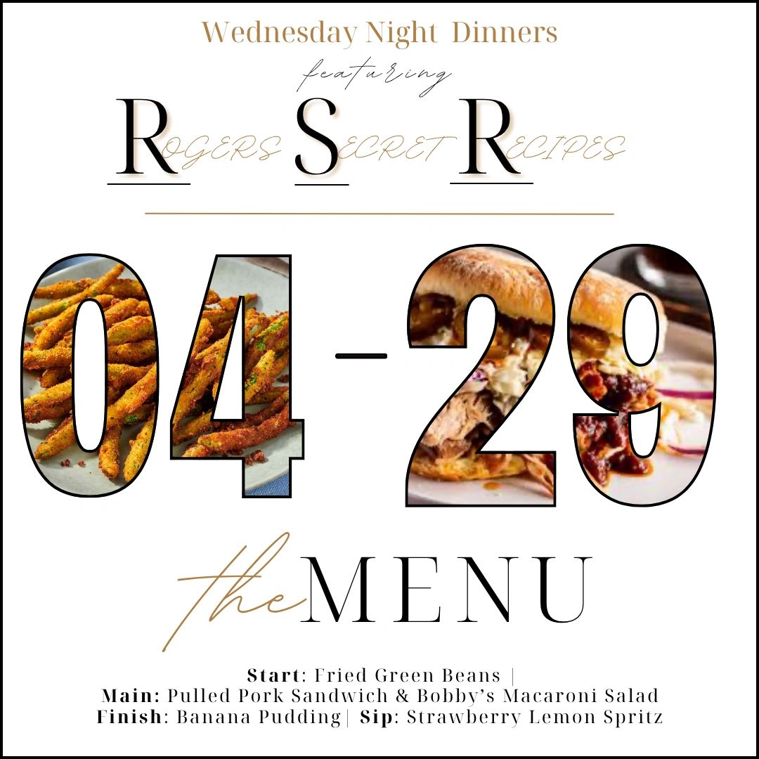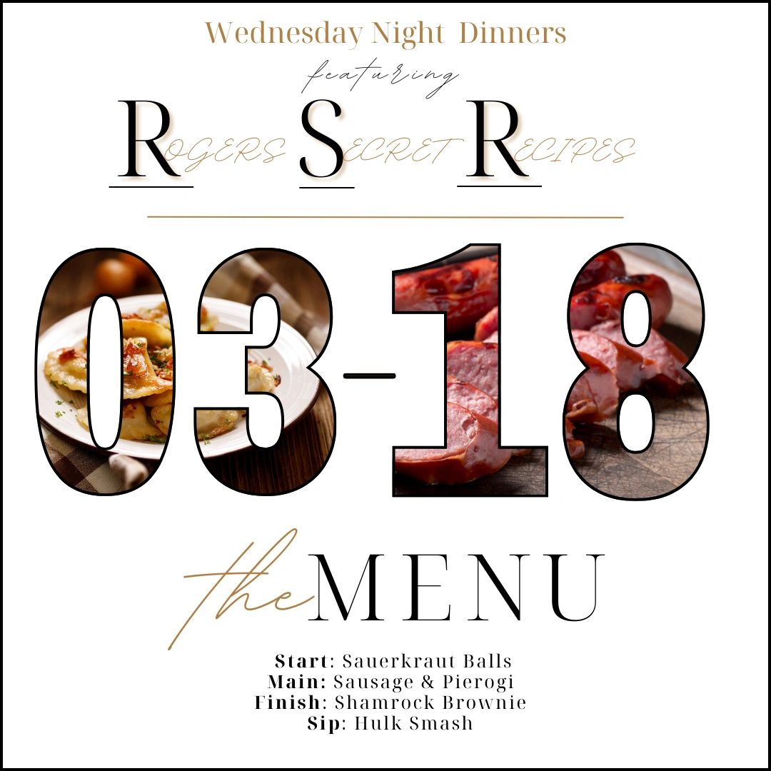 Every Wednesday night features select recipes straight from the family cookbook of our owners, Justin and Betsy Rogers. Each week they will show off a new meal to our patrons and their guests. Click below to view this week's menu and a preview of future offerings